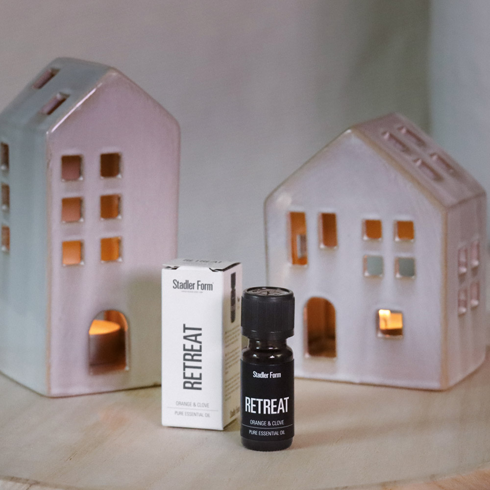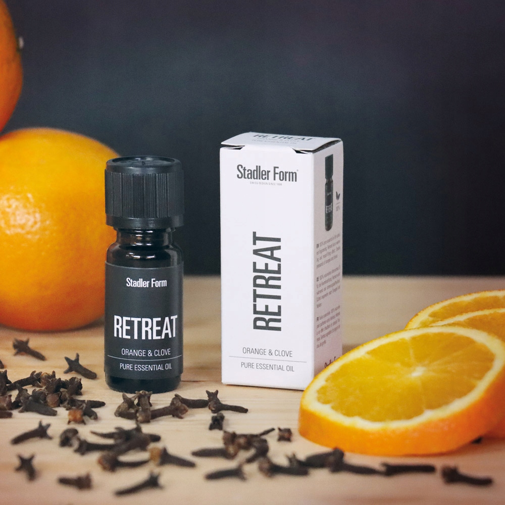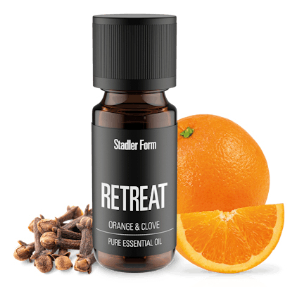 Zapach Retreat przywodzi na myśl przytulne zimowe i świąteczne wieczory pełne ciepła i harmonii. Głównymi składnikami tej w 100% naturalnej mieszanki olejków są pomarańcza i goździk.